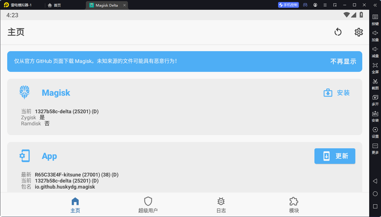 安装magisk debug for 雷电模拟器(下载链接里面的app-debug.apk),将软件从电脑拖动到电脑模拟器里面即可