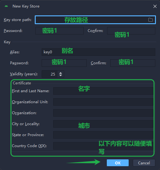 然后我们需要点击SIgning Config创建一个release版本,做出如下配置:
